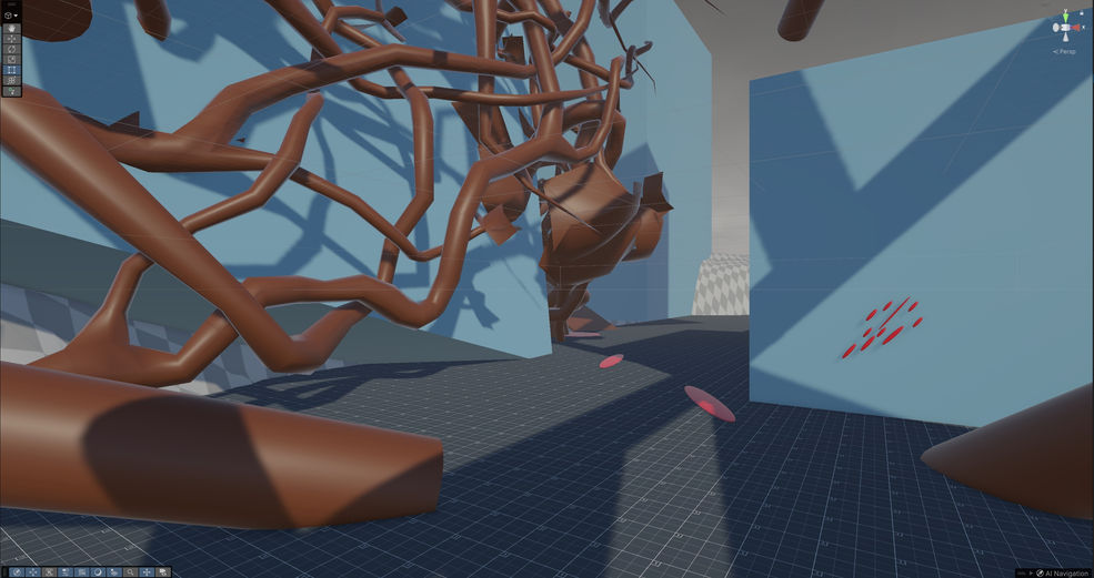 Create two spaces—one Jungle and one Sci-Fi—with two connectors. After two days, we swapped levels with a fellow student and were tasked with adding an additional Christmas tree, as well as creating a loop that moves from the Sci-Fi space through one connector into the Jungle space, and then back to the Sci-Fi space.